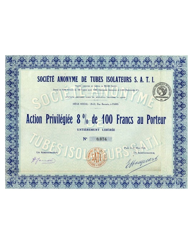 Priv. Share of 100F - Paris 1924