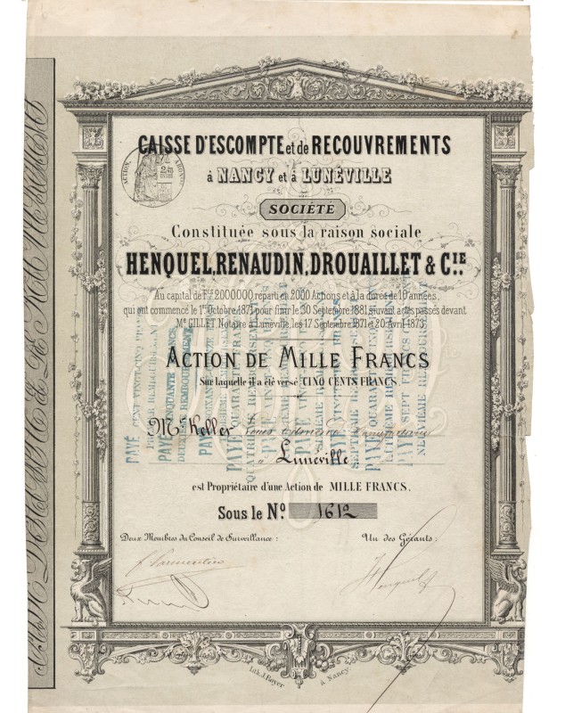 Caisse d'Escompte et de Recouvrements à Nancy et à Lunéville, Henquel, Renaudin, Drouaillet et Cie (1873)