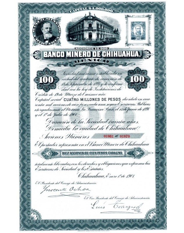 Cert. of 10 shares of 100 Ps - Chihuahua 1901