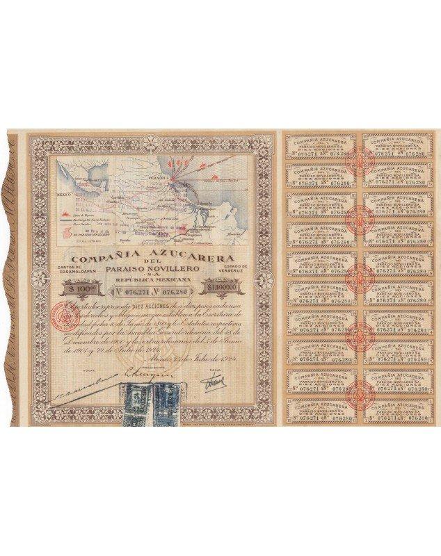 Certificate of 10 Shares of 10 Pesos each (100$) - Mexico 1924