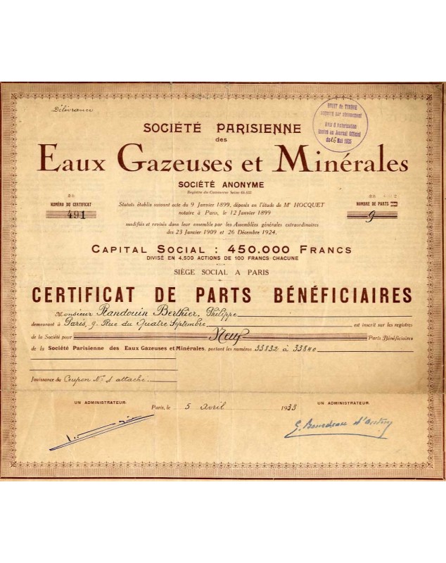 Certificate of Beneficiary Shares - Paris 1933