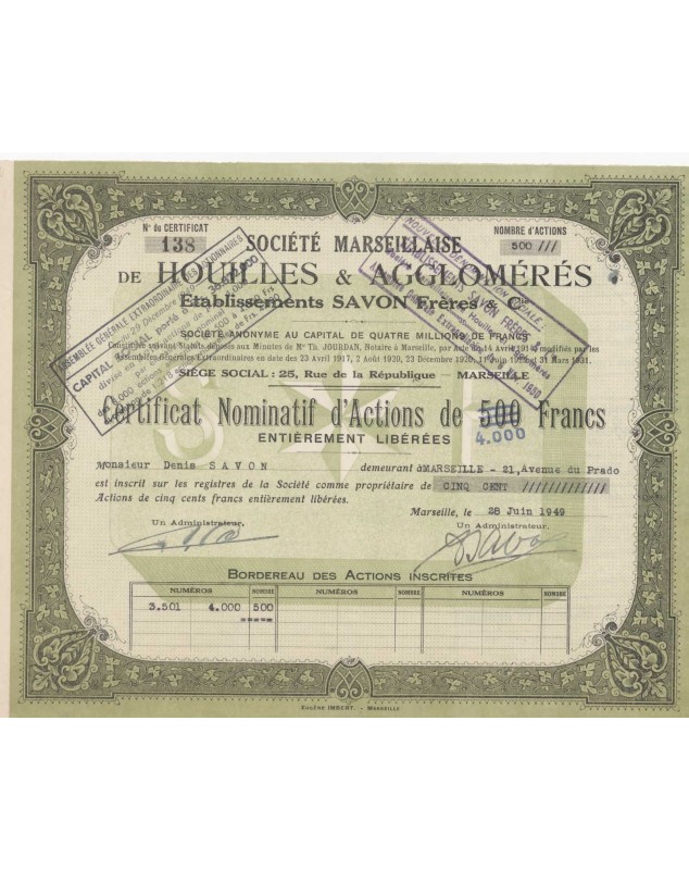 Registered certificate of 500 shares of 500F rectified 4000F issued in Marseilles in 1949.