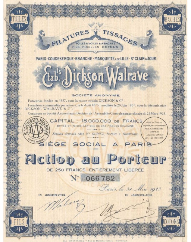 The company, founded in 1837 under the name Dickson & Cie, then formed in limited partnership by shares in 1875, manufactured canvas for sails and tarpaulins, threads, twines and cottons.