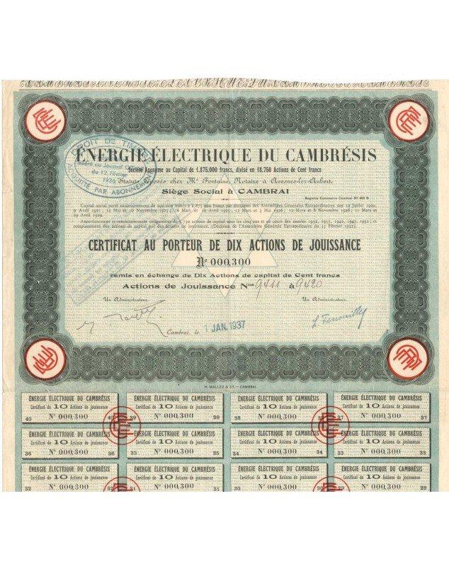 Certificate of 10 Shares - Cambrai 1937