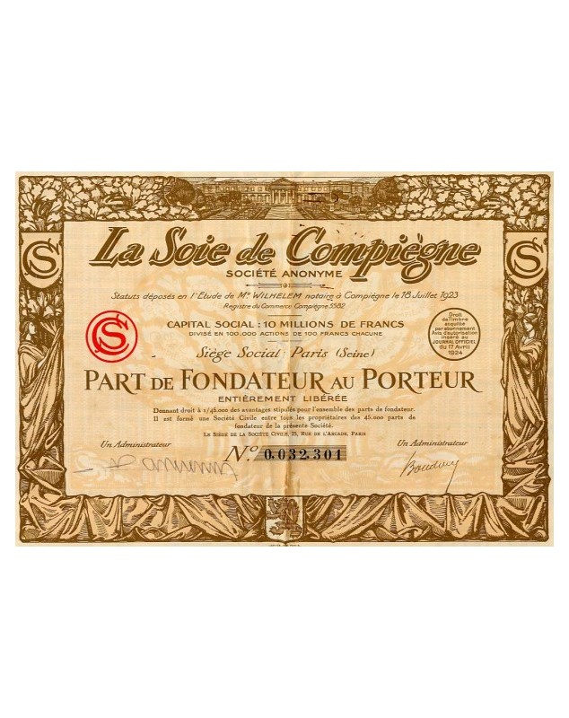 The Compiègne silk was a silk spinning company located in Clairoix, not far from Compiègne in the Oise. It was founded in 1923 by Henri Sinclair, former chemical engineer of the Société Générale de Soie Artificielle by the Viscose process. He brought the exclusive property of a French patent on "new processes and apparatus for the manufacture of artificial silk by the Viscose process".