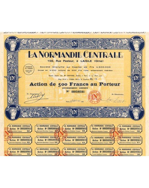 Bearer share of 500 francs issued in Paris in 1931. The company located in Laigle, 150 rue Pasteur (Orne) produced butter and milk.