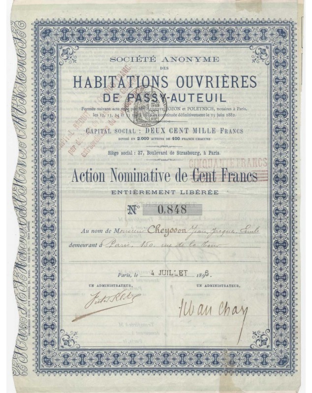 Nominal share of 100F rectifed to 50F - Paris 1896