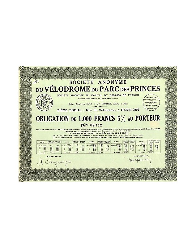 Bond of 1000 francs at 5% to bearer issued in Paris in 1932.