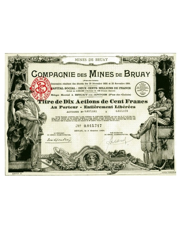 Certificate of 10 shares to bearer of 100 francs each issued in Bruay-en-Artois in 1939.