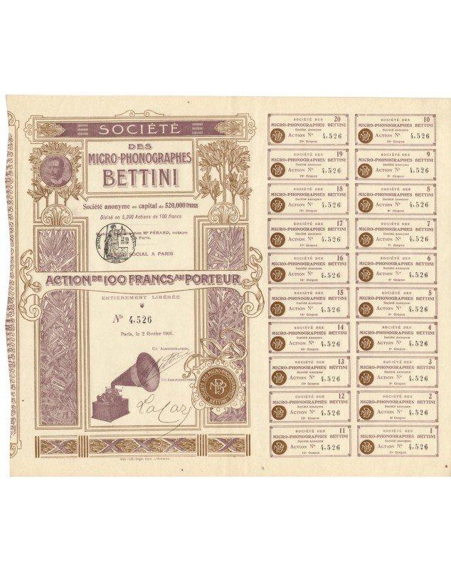 Share of 100 francs to bearer, issued in Paris in 1901. Beautiful design with a phonograph, the portrait and the signature of G. Bettini.