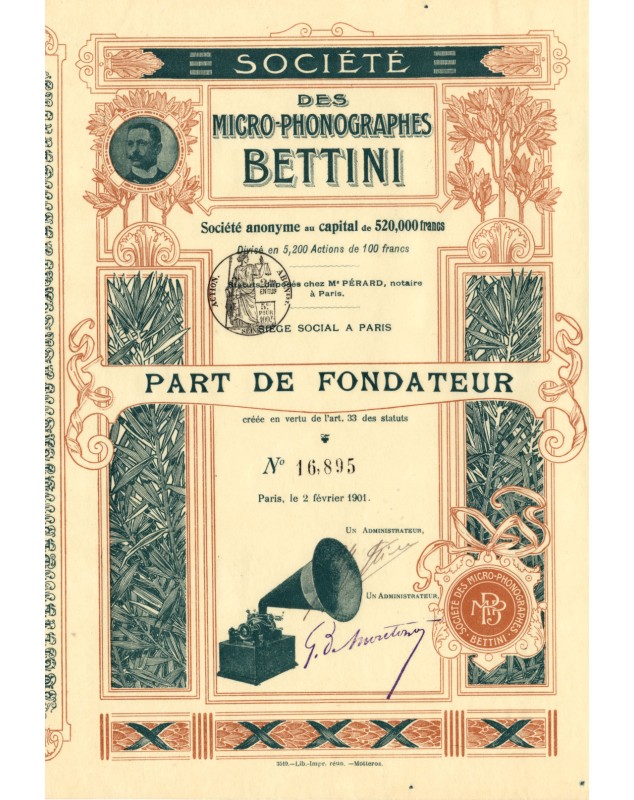Founder Share issued in Paris in 1901. Very nice design with a phonograph, the portrait and the signature of Gianni Bettini.