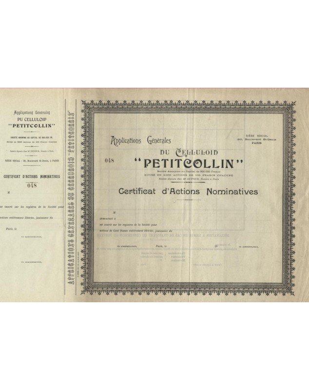 In 1857, in Etain (Meuse) Nicolas Petitcollin, manufactures hairdressing articles. His nephew Gustave Petitcollin joined him and they founded in Paris in 1899 the Société Applications Générale du Celluloid "Petitcollin".