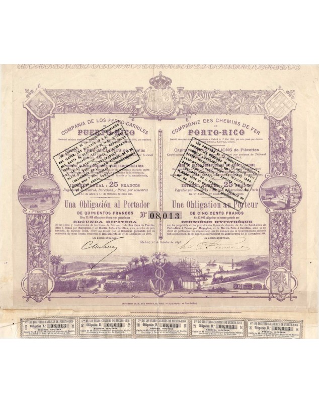 Second Mortgage Bond of 500 Pesetas (Piécettes or Francos) to bearer issued in Madrid in 1895, on the properties and earnings of the Railroad from Saint-Jean de Porto-Rico to Mayagüez and from Ponce to Mayagüez.
