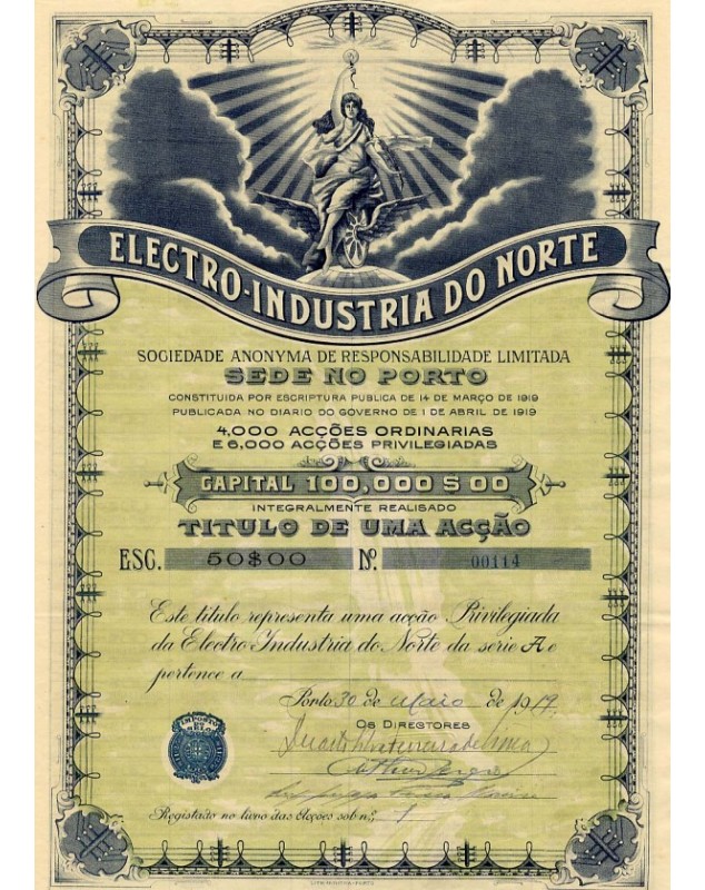 Cert. of 1 Share of 50 Esc. - Porto 1919