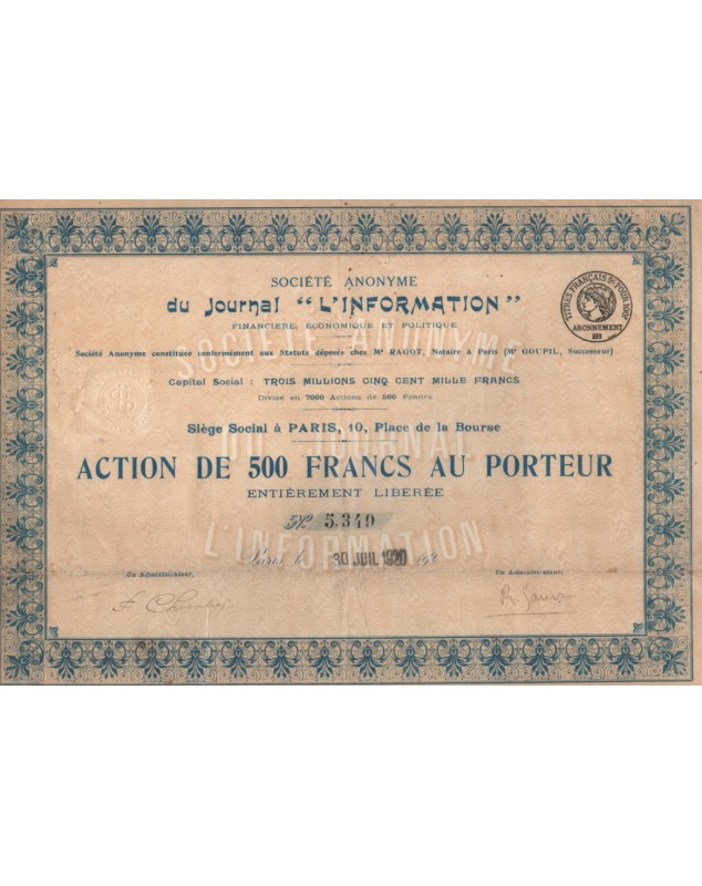S.A. du Journal "L'Information" Financière, Economique et Politique. 1920