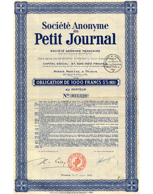 Le Petit Journal also experienced its growth thanks to the rotary presses developed by Hippolite Marinoni (1823-1904) allowing mass circulation. With a circulation of 400,000 copies in 1870, it exceeded all French political dailies. The company was dissolved in 1958.