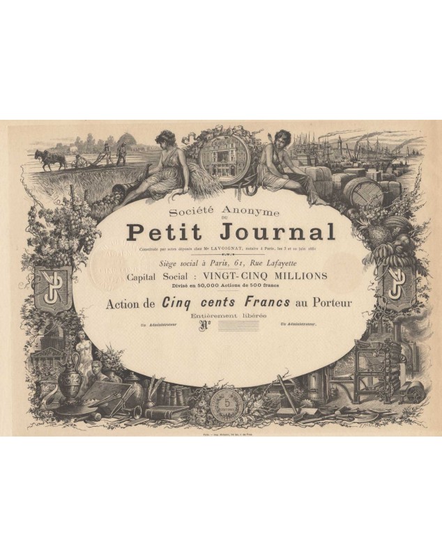Popular newspaper sold at 1 sou (5 centimes, coin illustrated on the share), it changed the lives of Parisians. The press being subject to censorship, at the slightest criticism or political allusion, the fines fell. At the slightest recurrence, it was the ban. Le Petit Journal was thus the first to relay news items, giving itself the sensational editorial line.