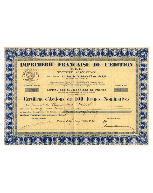 Certificate of 85 nominal shares of 100F - Paris 1933