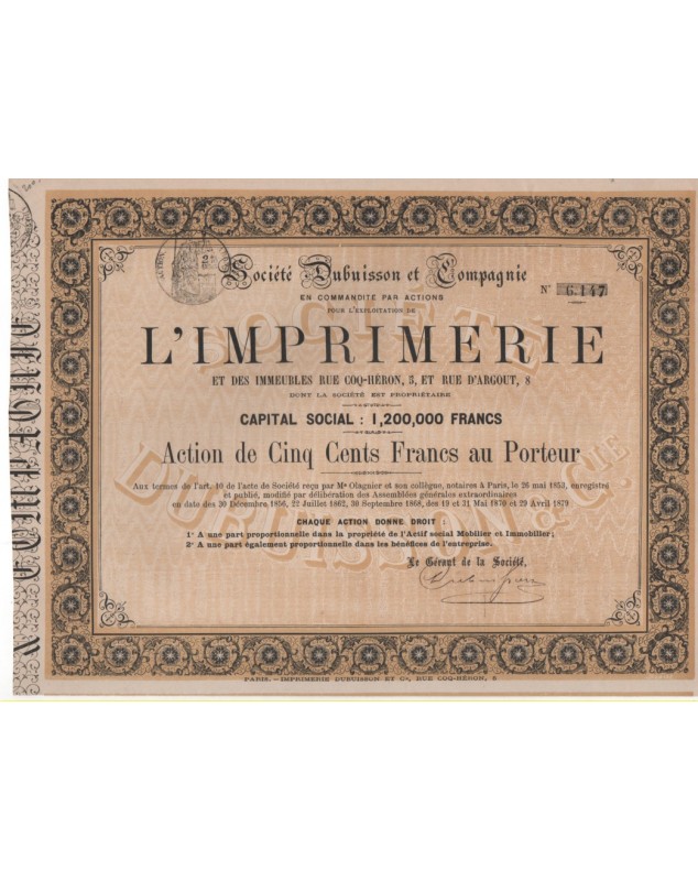 Sté Dubuisson et Cie pour l'Exploitation de l'Imprimerie et des Immeubles Rue Coq-Héron, et rue d'Argout