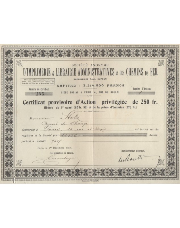 Provisory certificate for a privileged share of 250F - Paris 1928