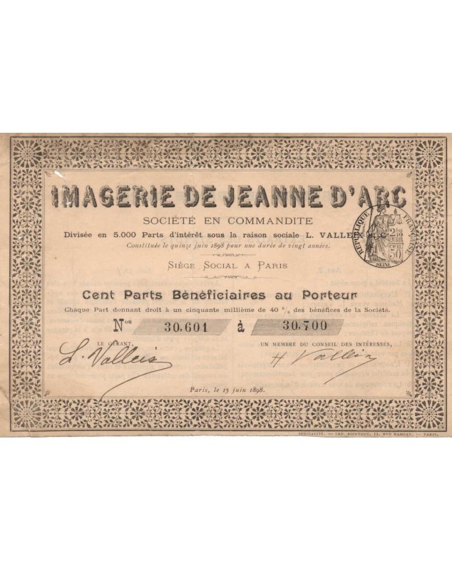 Lot of 3 certificates: Certificate of 5, 20 and 100 Beneficiary shares to bearer issued in Paris in 1898 by the Société en commandite de l'Imagerie de Jeanne d'Arc, for the purpose of exploiting the artistic works published by Madame Veuve L Valleix, the creation and operation of all religious artistic works or works recalling the great periods of history, the acquisition and operation of a printing press, etc. (statutes on the back)