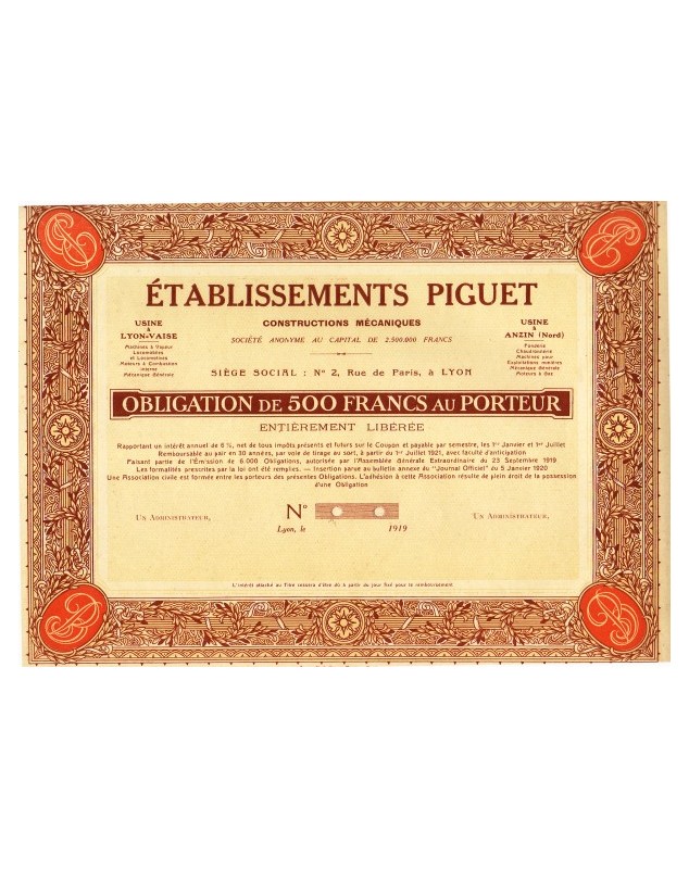 Bond to bearer of 500 francs issued in Lyon, 2 rue de Paris in 1919.