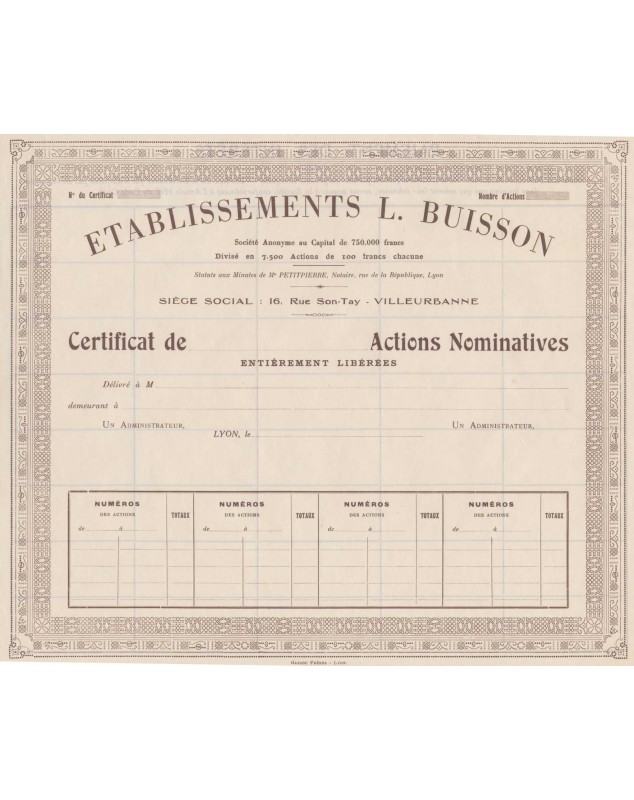Certificate of Nominatives Shares - Villeurbanne, unissued