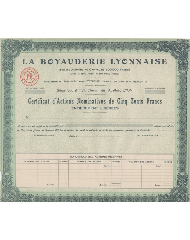 Certificate of Nominative shares of 500F - Lyon, unissued