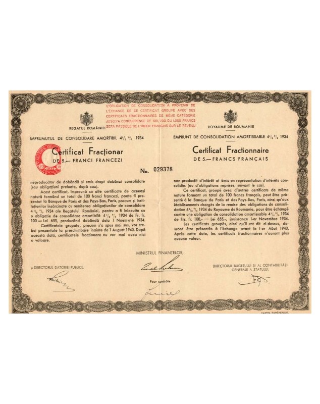 Fractional certificate of 5F - Bucarest/Paris 1934