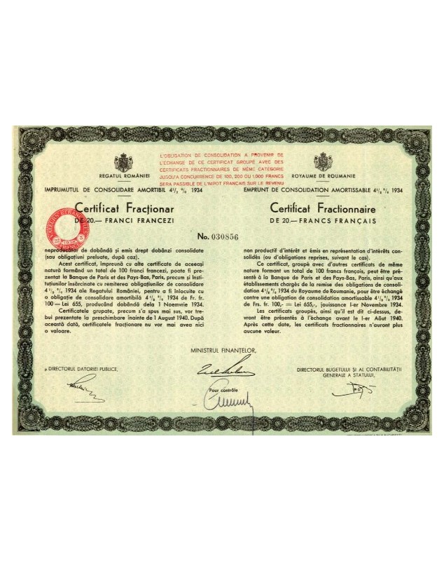 Fractional certificate of 20F -Bucarest/Paris 1934