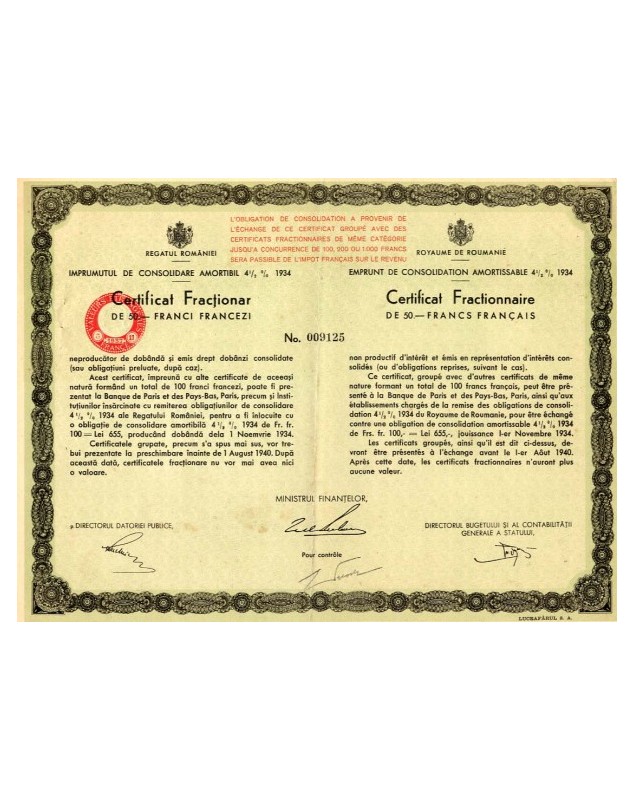 Fractional certificate of 50F -Bucarest/Paris 1934