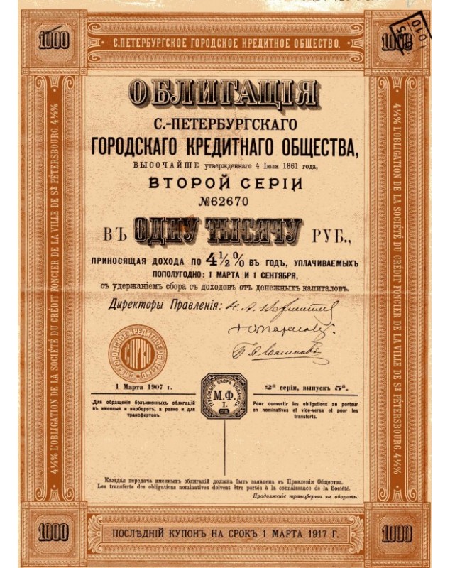 4,5% Bond of 1000 Rbl - St-Petersburg 1907