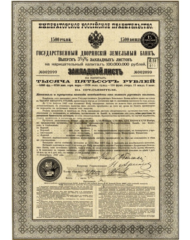 Imperial Land Bank for the Nobility - 1500 Rbl 3.5% 1897