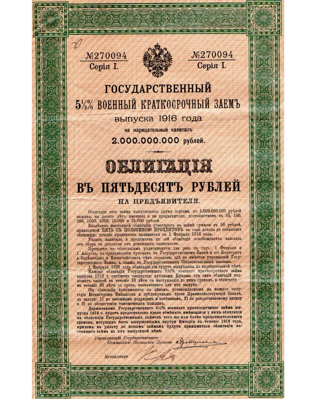 5.5% Russian short-term military war loan 1916 - Serie I (50 Rbl)