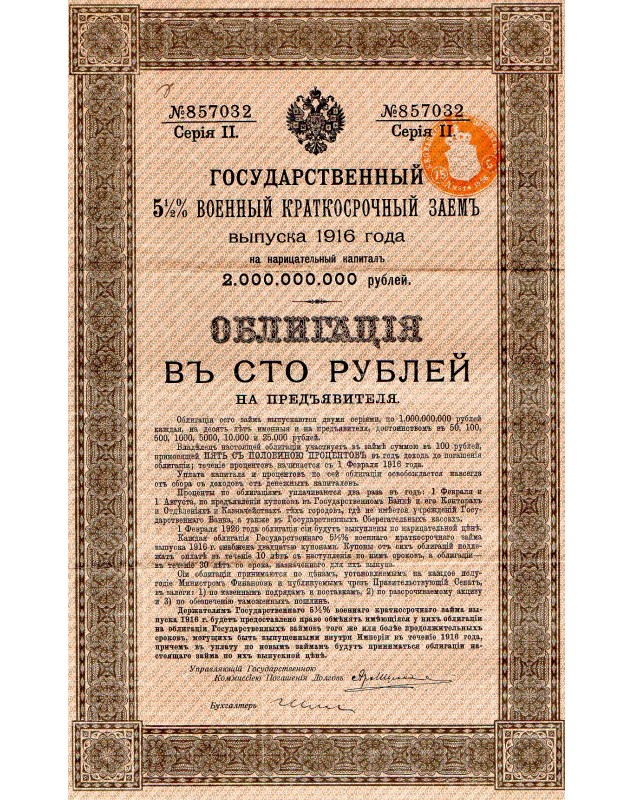 5.5% Russian short-term military war loan 1916 - Serie II (100 Rbl)