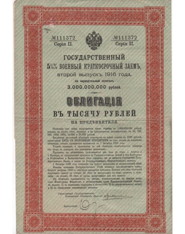 5.5% Russian short-term military war Second loan 1916 - Serie II (1,000 Rbl)