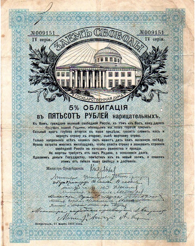 The so-called Kerensky loans were issued under Alexander Kerensky, a Labor lawyer, minister of justice under the Duma, who became head of the provisional government formed after the abdication of Tsar Nicholas II and the Bolshevik revolution. It was a 3 billion ruble war loan also called "freedom loans". The loan is signed by representatives of the Minister-President.
