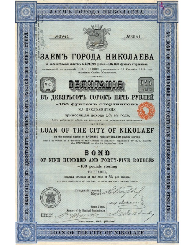 5% Bond of 946 Rbl or 100£ - Nikolaef 1912