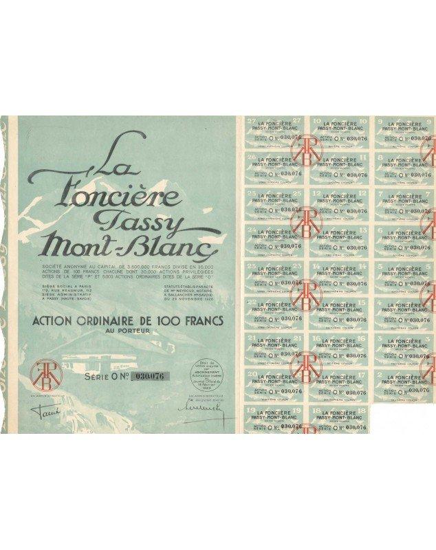 The company had an administrative headquarters in Passy in Haute-Savoie. Statutes of the company issued by Maître Neyroud, Notary in Sallanches in 1928. Title with all coupons. Nice scenery of mountains and chalets in the background.