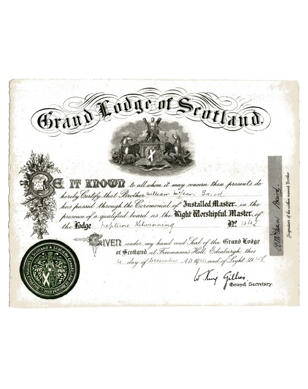 Nominal Cert. of the Grand Lodge of Scotland- Edinburgh 1944