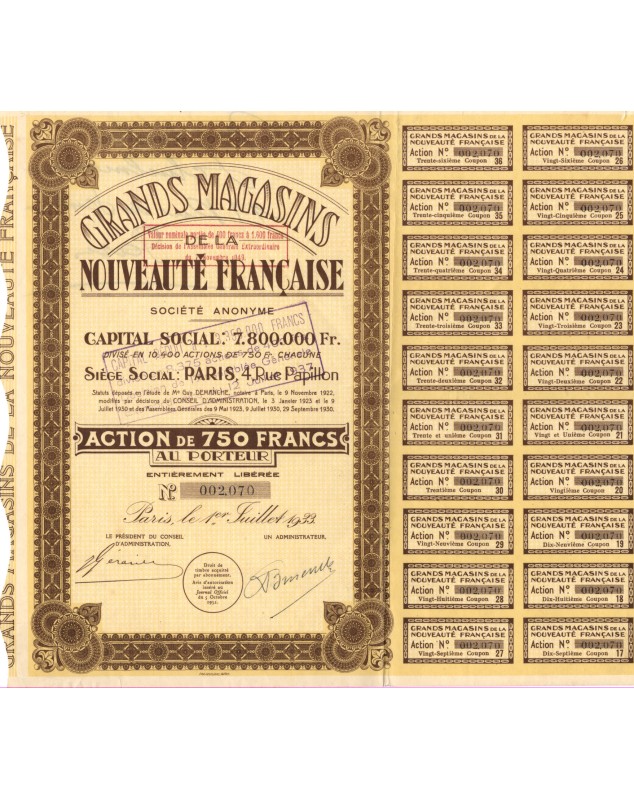 Bearer share of 750 francs issued in Paris in 1933. Head office 4 rue Papillon, Paris.