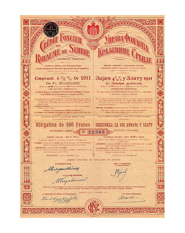 Crédit Foncier du Royaume de Serbie (Ouprava Fondova)- 4,5% Gold Loan 1911