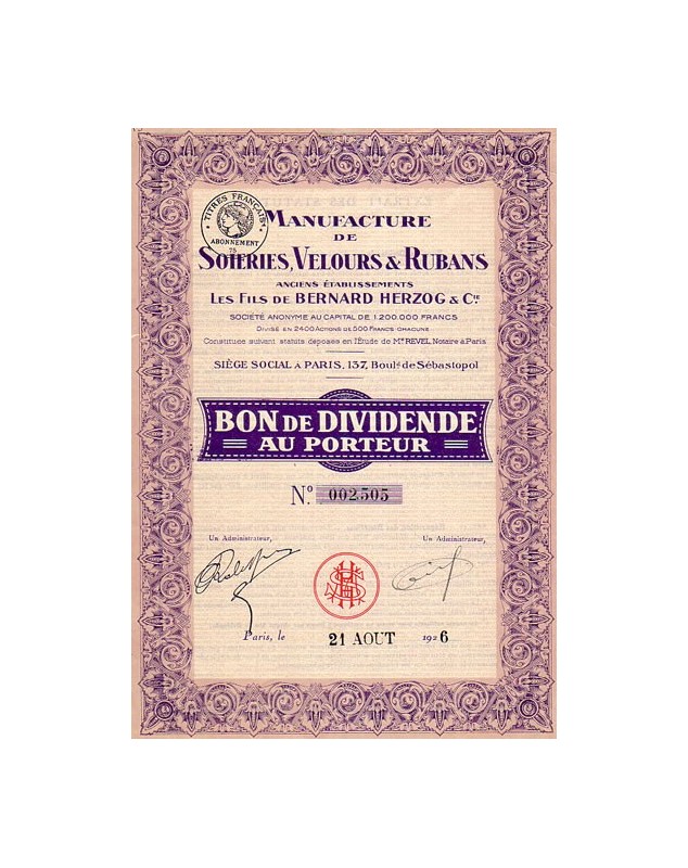 Manufacture de Soieries, Velours & Rubans. Anciens Ets Les Fils de Bernard Herzog & Cie