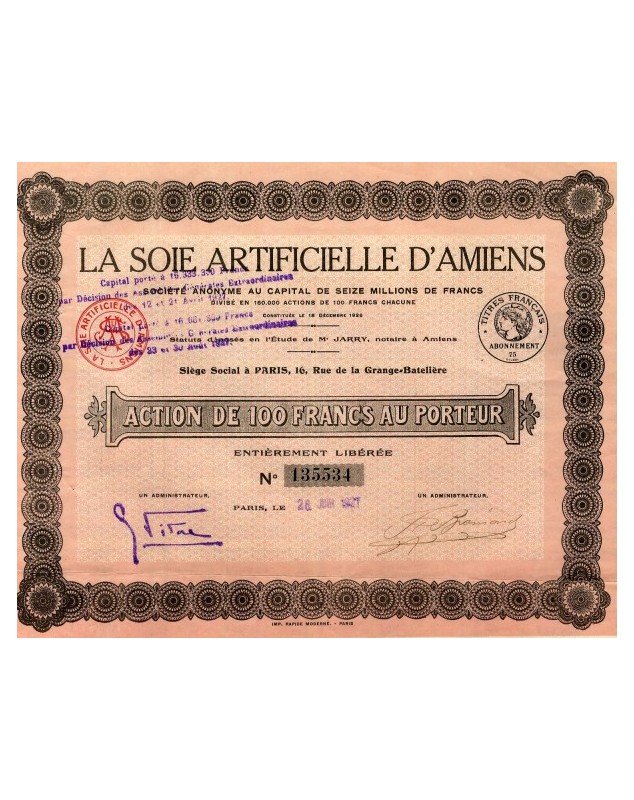 Share of 100F to bearer issued in Paris 1927 or 1929.