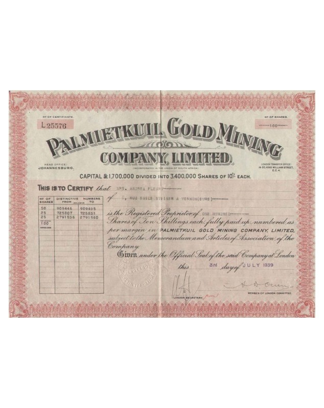 Registered Share Cert. of 10 Shllgs each - London 1939