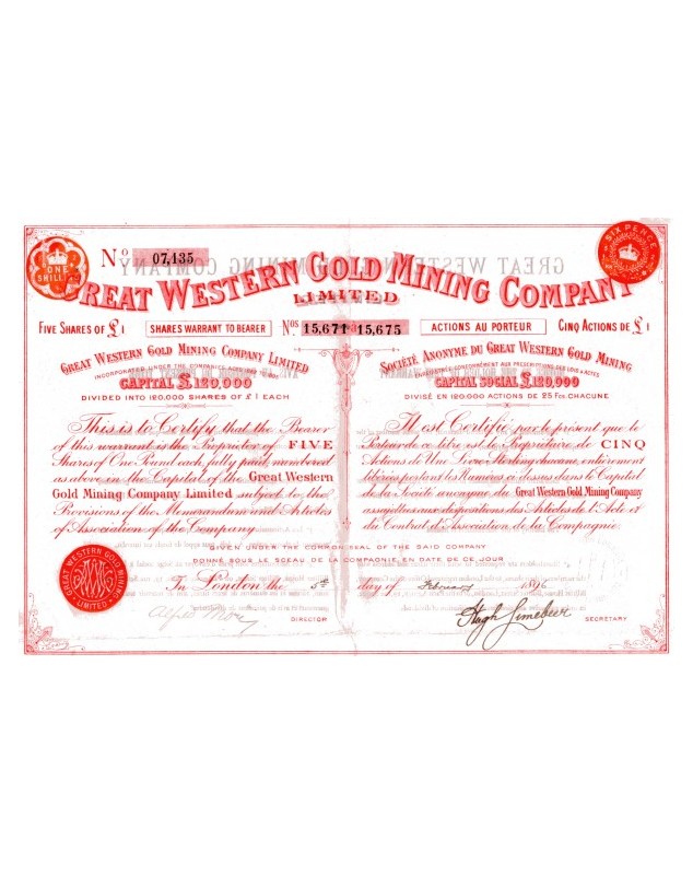 Certificate of 5 shares of 1£ issued in London in 1896.