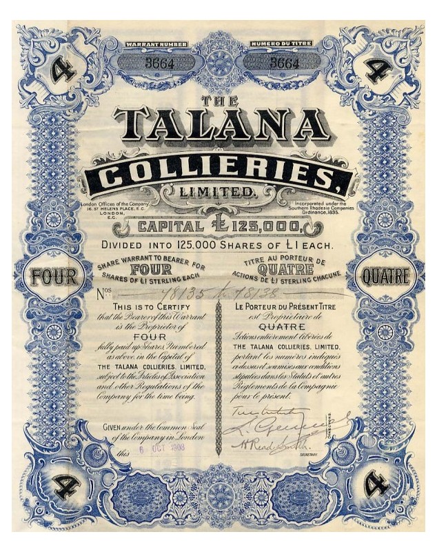 Certificate of 4 shares of 1£ each issued in London in 1908.