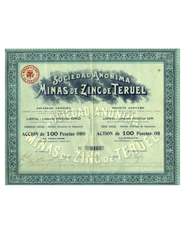 Share of 100 Gold Pesetas to bearer issued in Tolosa (Province of Guipuzcoa) in 1906.