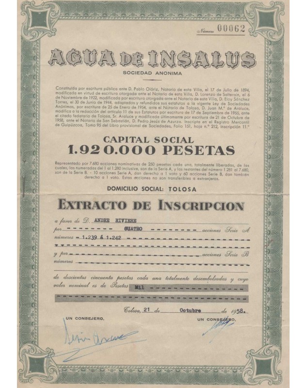 Certificate of 4 Shares of 1000 Pesetas - Tolosa 1958
