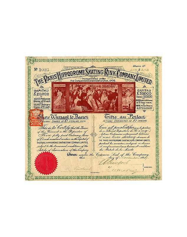 Certificate of 5 shares of £1 each issued in Paris in 1909.